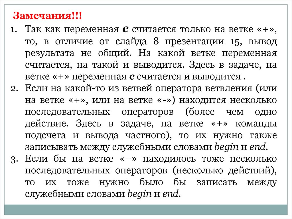 Замечания!!!1. Так как переменная с считается только на ветке «+»,