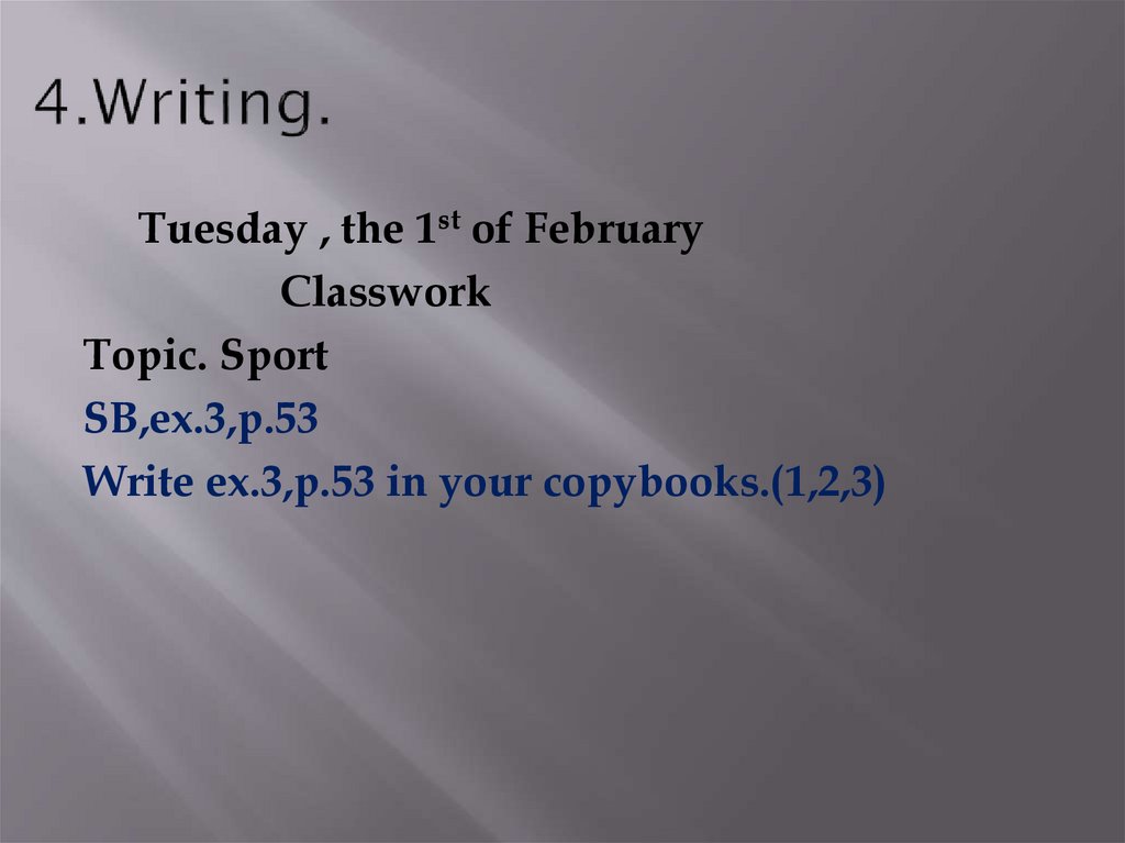 Write ex.3,p.53 in your copybooks.(1,2,3)
