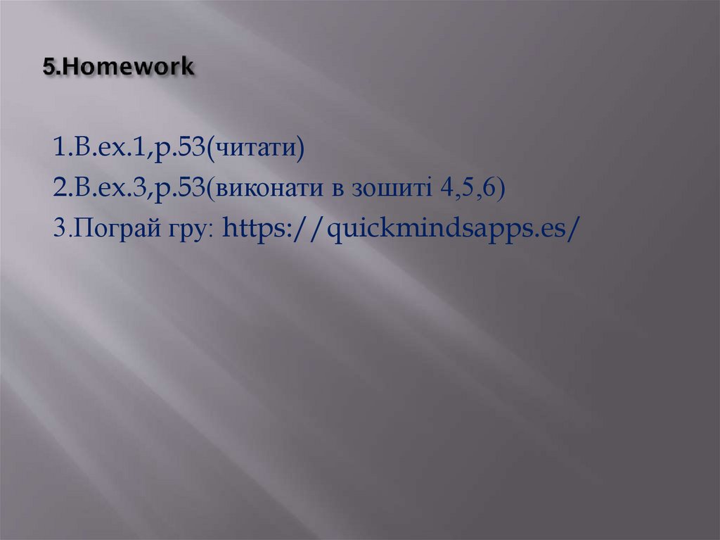 1.B.ex.1,p.53(читати)2.B.ex.3,p.53(виконати в зошиті 4,5,6)