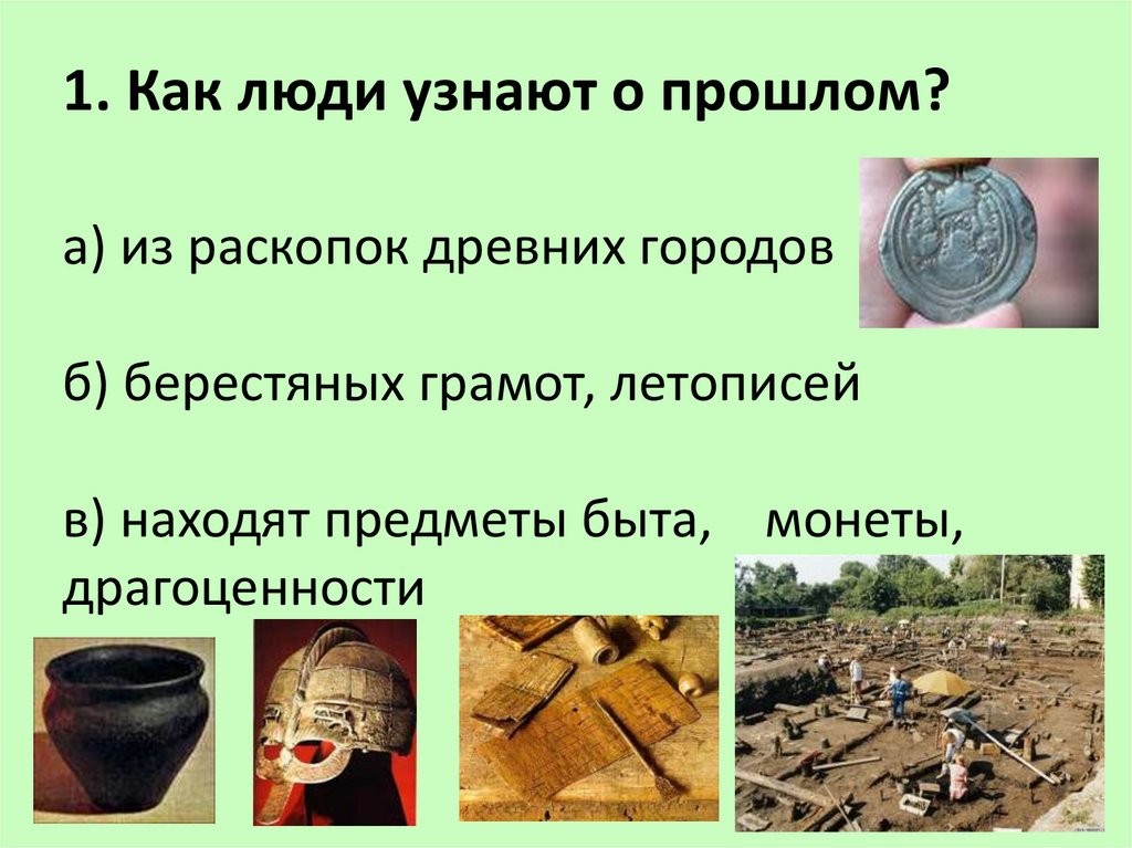 1. Как люди узнают о прошлом?а) из раскопок древних городов
