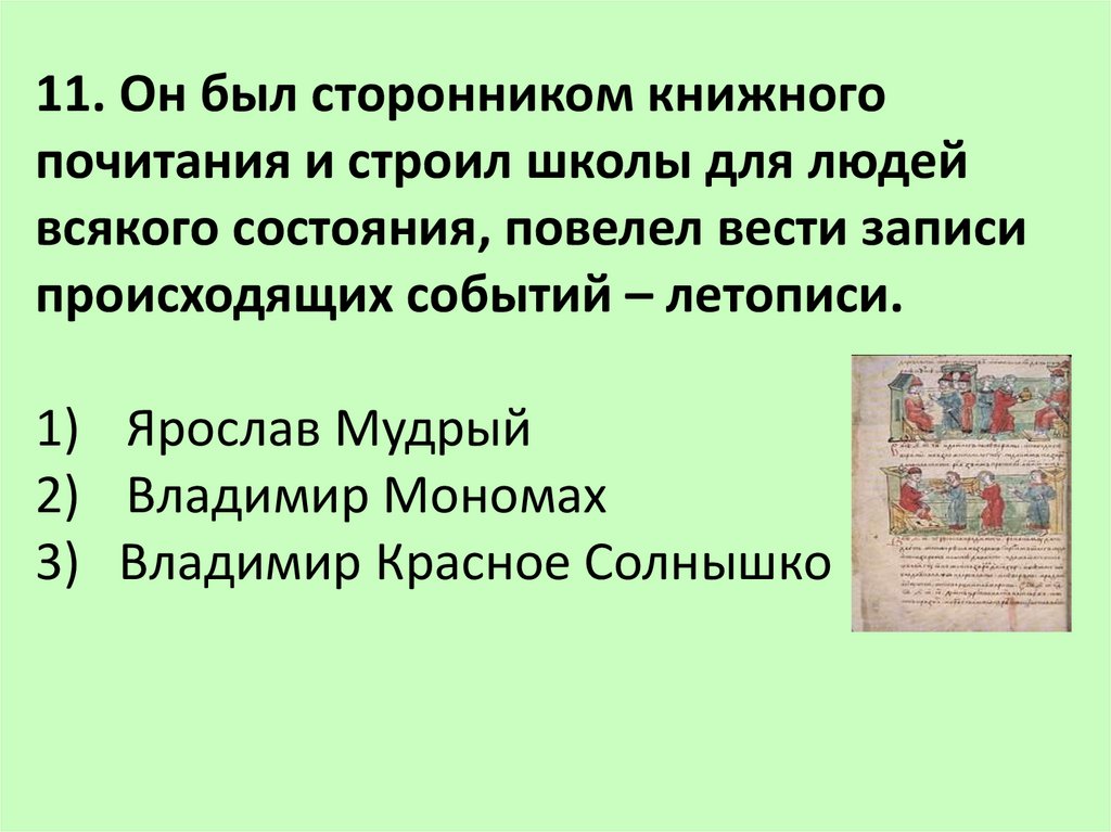 11. Он был сторонником книжногопочитания и строил школы для людей