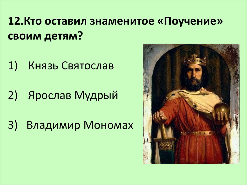 12.Кто оставил знаменитое «Поучение»своим детям?