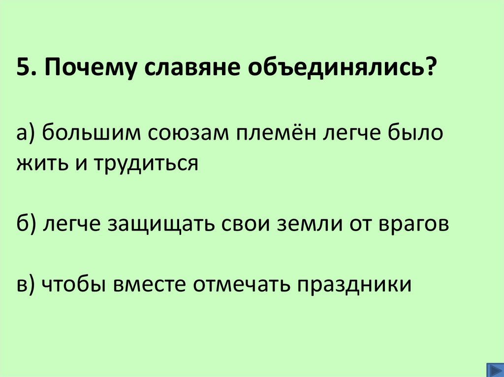 5. Почему славяне объединялись?а) большим союзам племён легче было