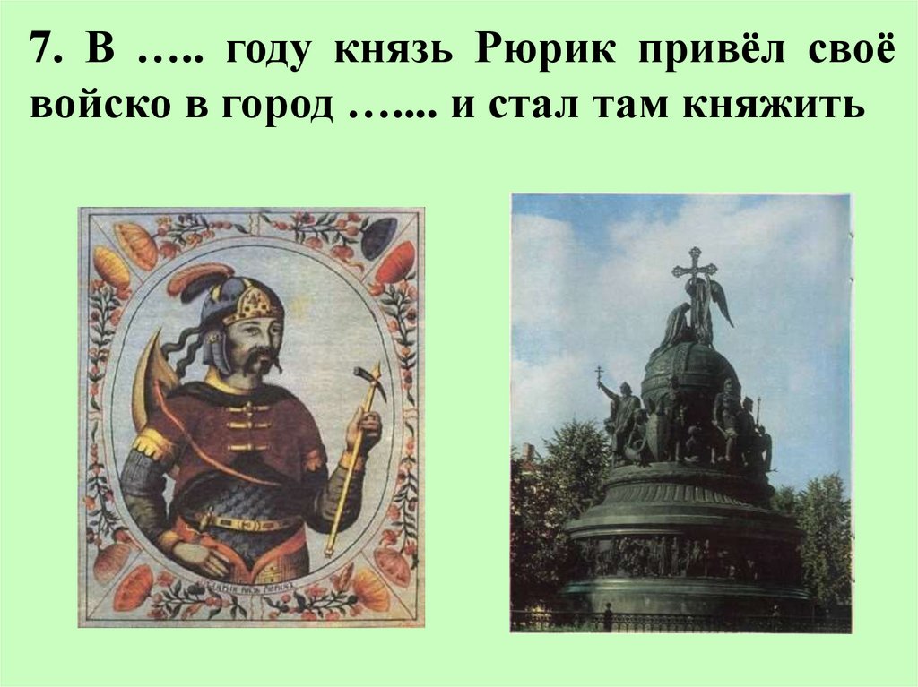 7. В ….. году князь Рюрик привёл своёвойско в город ….... и стал там княжить