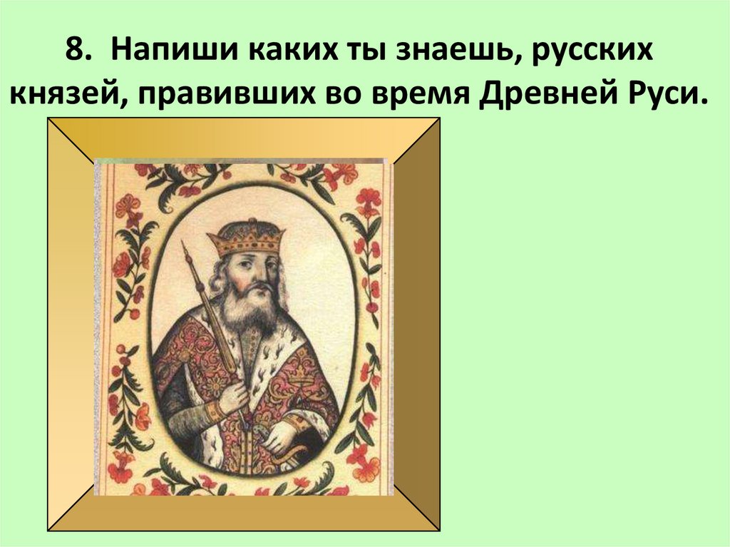 8. Напиши каких ты знаешь, русскихкнязей, правивших во время Древней Руси.