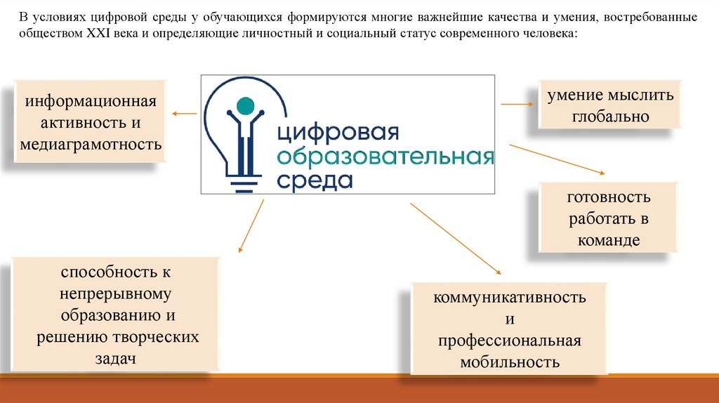 В условиях цифровой среды у обучающихся формируются многие важнейшие качества и умения, востребованныеобществом XXI века и определяющие личностный и социальный статус современного человека: