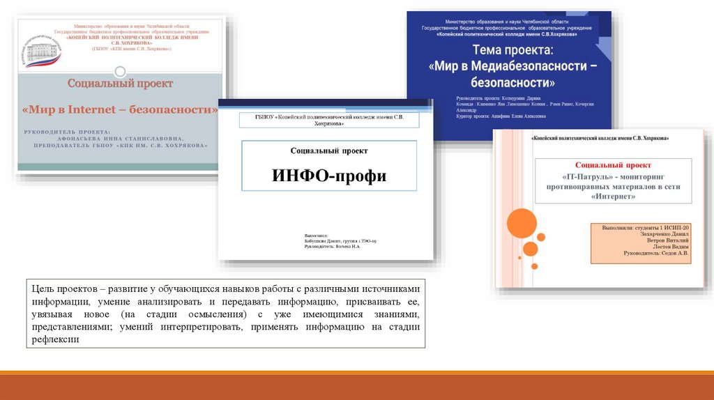 Цель проектов – развитие у обучающихся навыков работы с различными источникамиинформации, умение анализировать и передавать информацию, присваивать ее,
