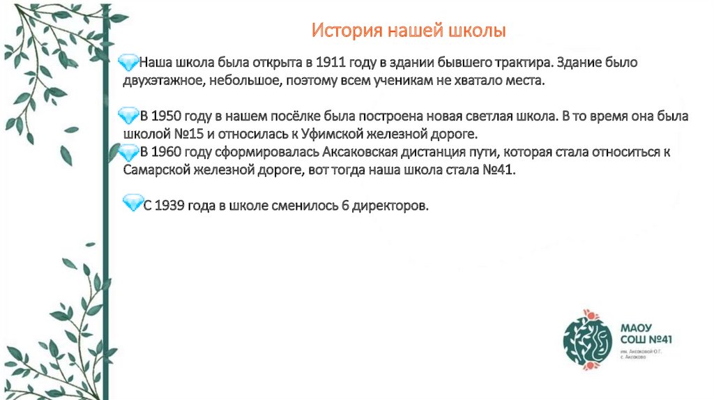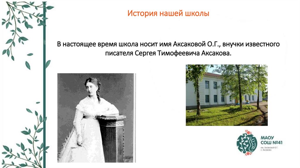 История нашей школыВ настоящее время школа носит имя Аксаковой О.Г., внучки известного
