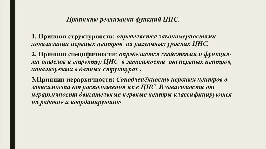 Принципы реализации функций ЦНС:1. Принцип структурности: определяется закономерностями