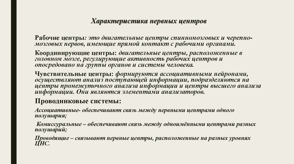 Характеристика нервных центровРабочие центры: это двигательные центры спинномозговых и черепномозговых нервов, имеющие прямой контакт с рабочими органами.