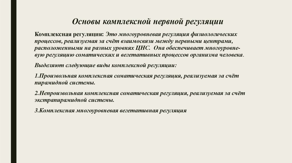 Основы комплексной нервной регуляцииКомплексная регуляция: Это многоуровневая регуляция физиологических