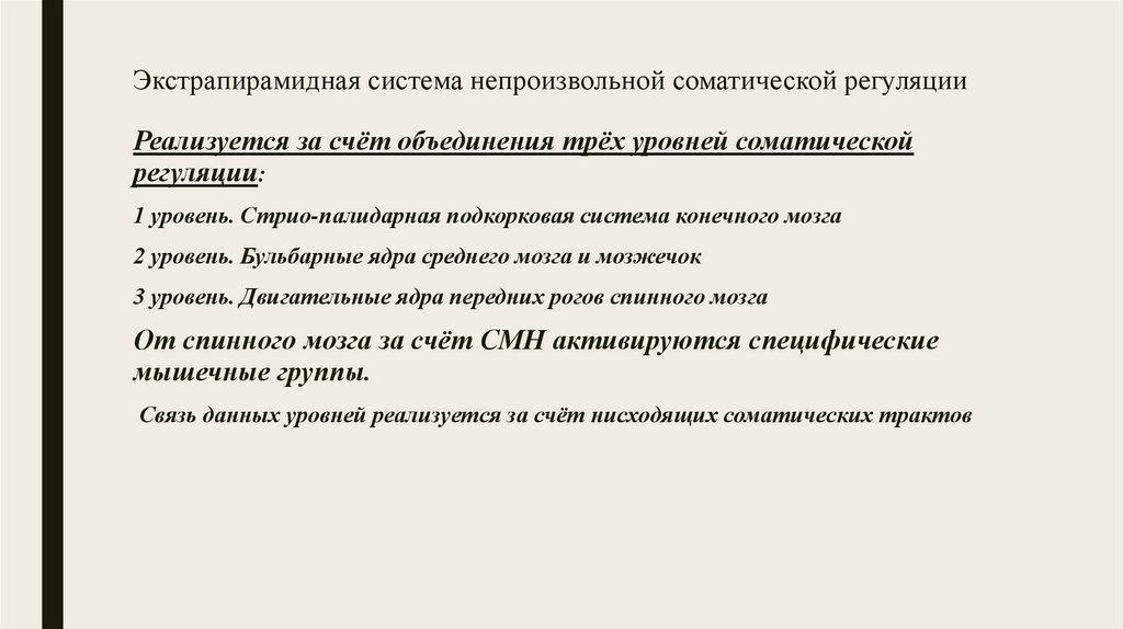 Экстрапирамидная система непроизвольной соматической регуляцииРеализуется за счёт объединения трёх уровней соматической