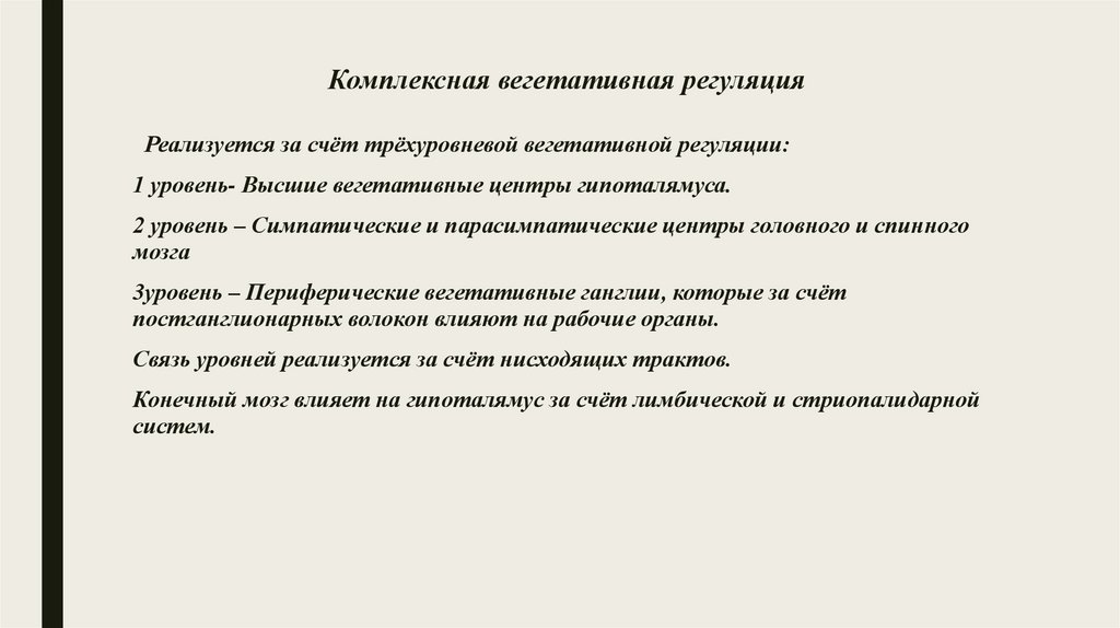 Комплексная вегетативная регуляцияРеализуется за счёт трёхуровневой вегетативной регуляции: