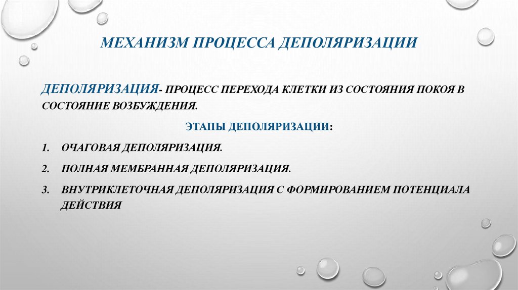 МЕХАНИЗМ ПРОЦЕССА ДЕПОЛЯРИЗАЦИИДЕПОЛЯРИЗАЦИЯ- ПРОЦЕСС ПЕРЕХОДА КЛЕТКИ ИЗ СОСТОЯНИЯ ПОКОЯ В