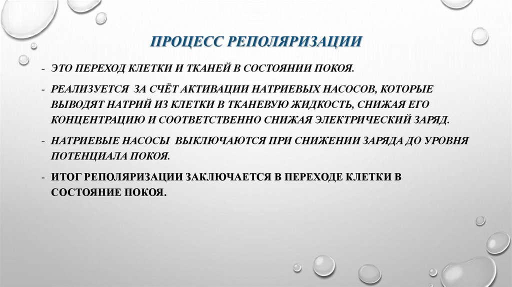 ПРОЦЕСС РЕПОЛЯРИЗАЦИИ- ЭТО ПЕРЕХОД КЛЕТКИ И ТКАНЕЙ В СОСТОЯНИИ ПОКОЯ.