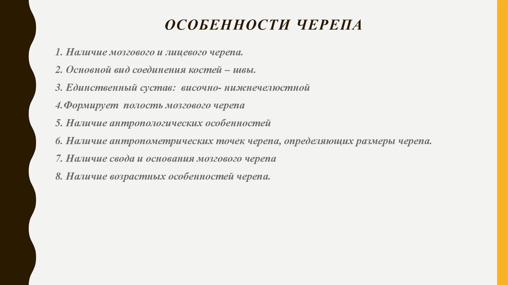 ОСОБЕННОСТИ ЧЕРЕПА1. Наличие мозгового и лицевого черепа.