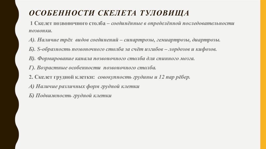 ОСОБЕННОСТИ СКЕЛЕТА ТУЛОВИЩА1 Скелет позвоночного столба – соединённые в определённой последовательности