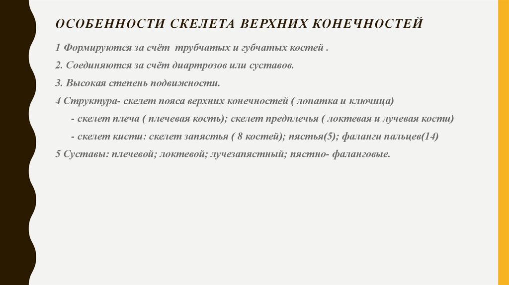 ОСОБЕННОСТИ СКЕЛЕТА ВЕРХНИХ КОНЕЧНОСТЕЙ1 Формируются за счёт трубчатых и губчатых костей .