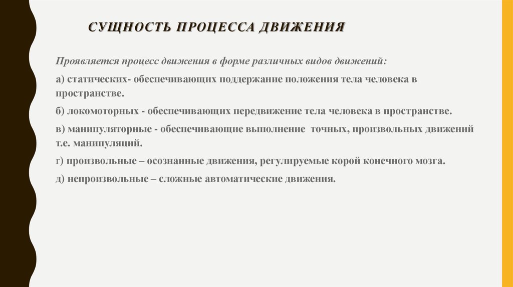 СУЩНОСТЬ ПРОЦЕССА ДВИЖЕНИЯПроявляется процесс движения в форме различных видов движений: