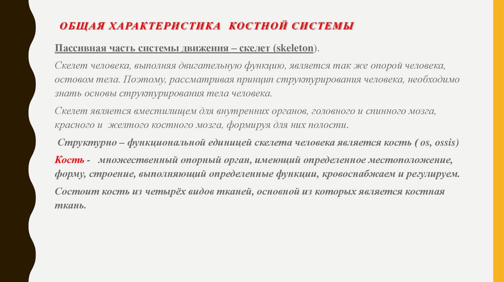 О Б Щ АЯ ХАРАКТ ЕР И СТ И КА КО СТ Н О Й СИ СТ ЕМЫПассивная часть системы движения – скелет (skeleton).