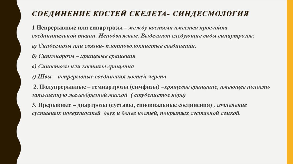 СОЕДИНЕНИЕ КОСТЕЙ СКЕЛЕТА - СИНДЕСМОЛОГИЯ1 Непрерывные или синартрозы – между костями имеется прослойка