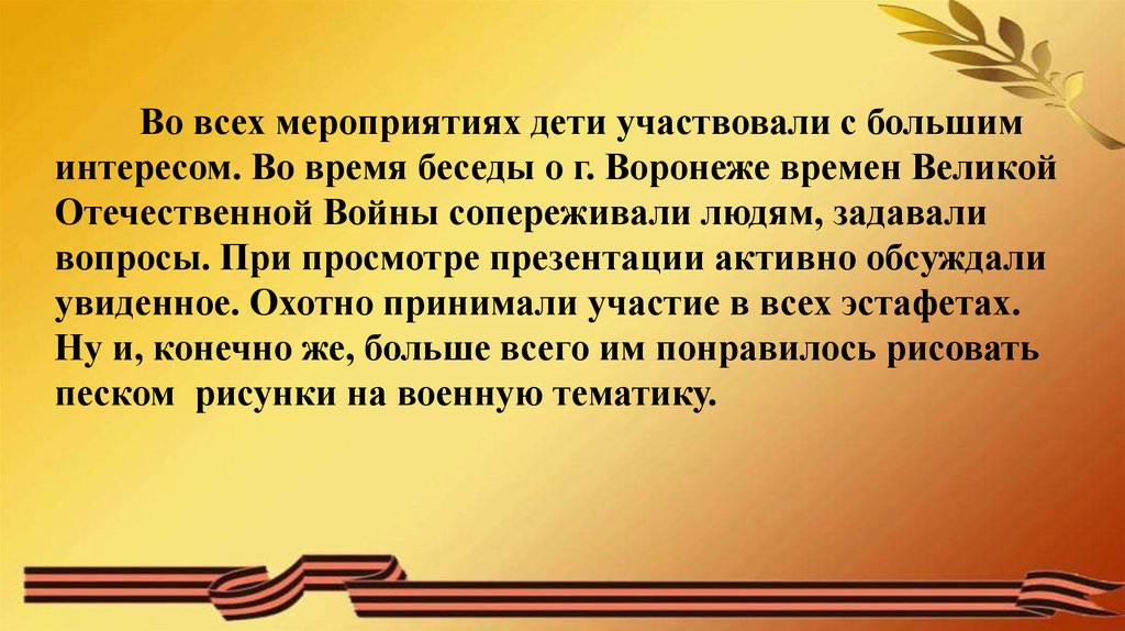 Во всех мероприятиях дети участвовали с большиминтересом. Во время беседы о г. Воронеже времен Великой