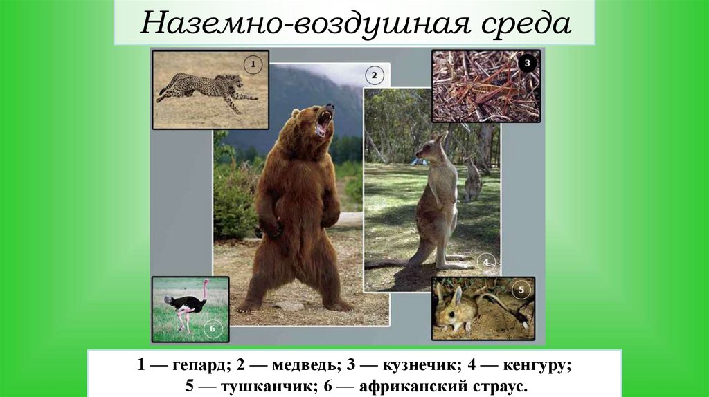 Наземно-воздушная среда1 — гепард; 2 — медведь; 3 — кузнечик; 4 — кенгуру;