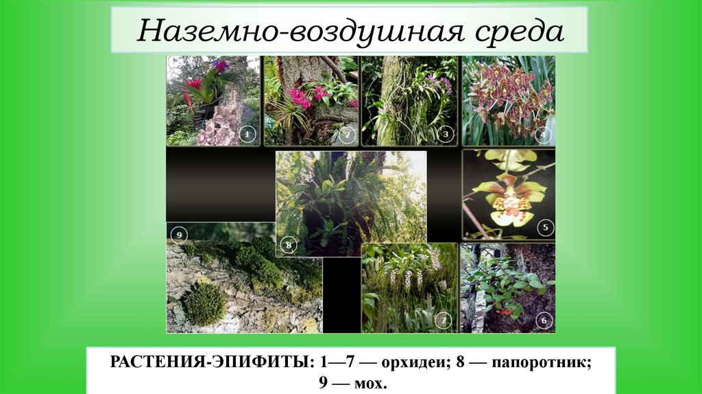 Наземно-воздушная средаРАСТЕНИЯ-ЭПИФИТЫ: 1—7 — орхидеи; 8 — папоротник;