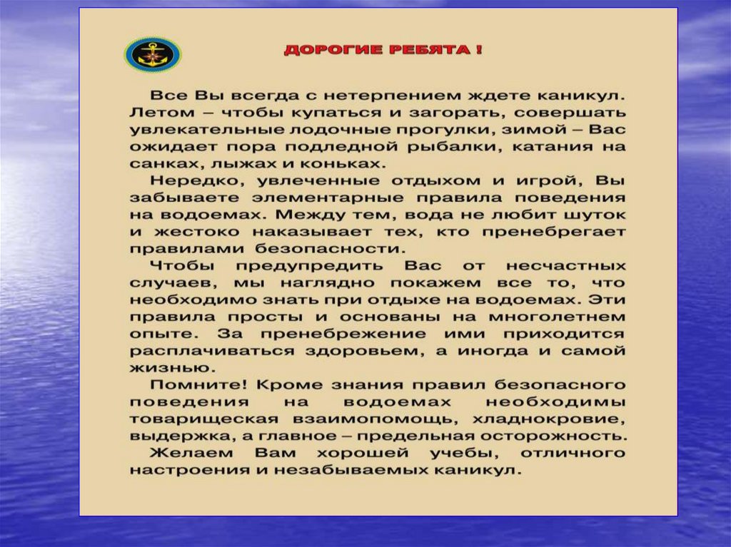 МЕРЫ ПРЕДОСТОРОЖНОСТИ НА ВОДОЕМАХ В