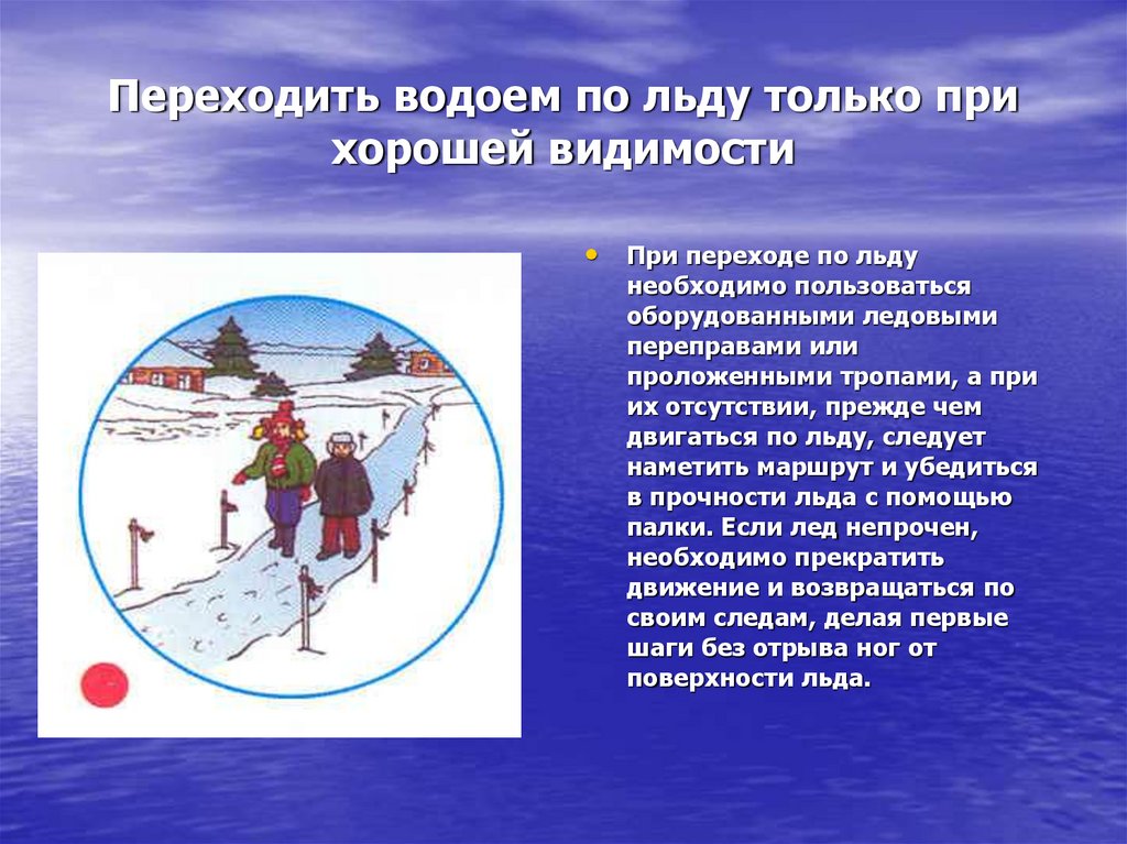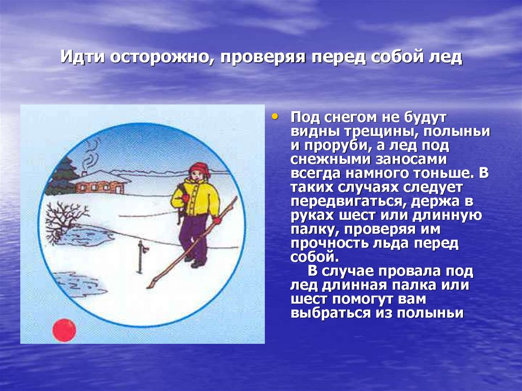 Идти осторожно, проверяя перед собой лед• Под снегом не будут