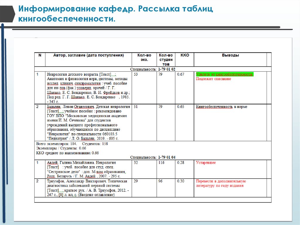 Информирование кафедр. Рассылка таблицкнигообеспеченности.