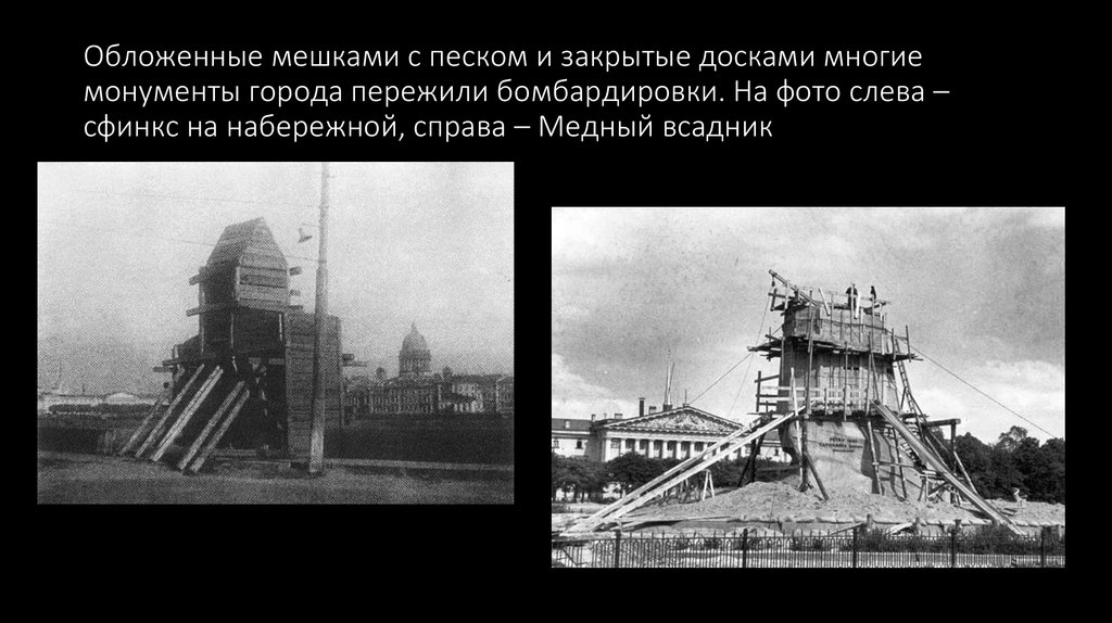 Обложенные мешками с песком и закрытые досками многиемонументы города пережили бомбардировки. На фото слева –