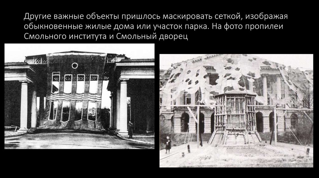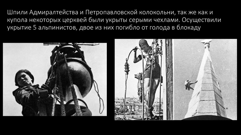Шпили Адмиралтейства и Петропавловской колокольни, так же как икупола некоторых церквей были укрыты серыми чехлами. Осуществили