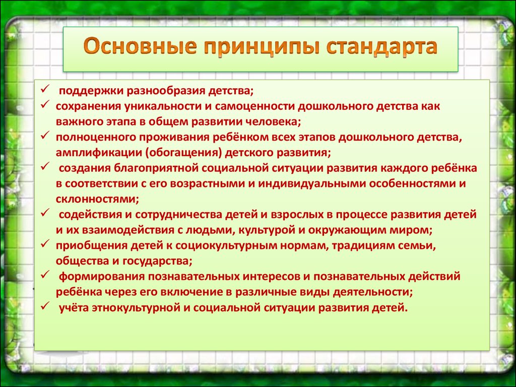 поддержки разнообразия детства;сохранения уникальности и самоценности дошкольного детства как