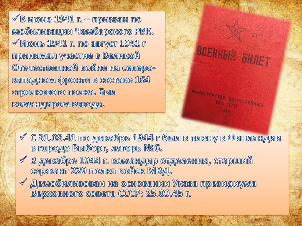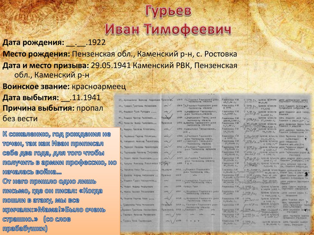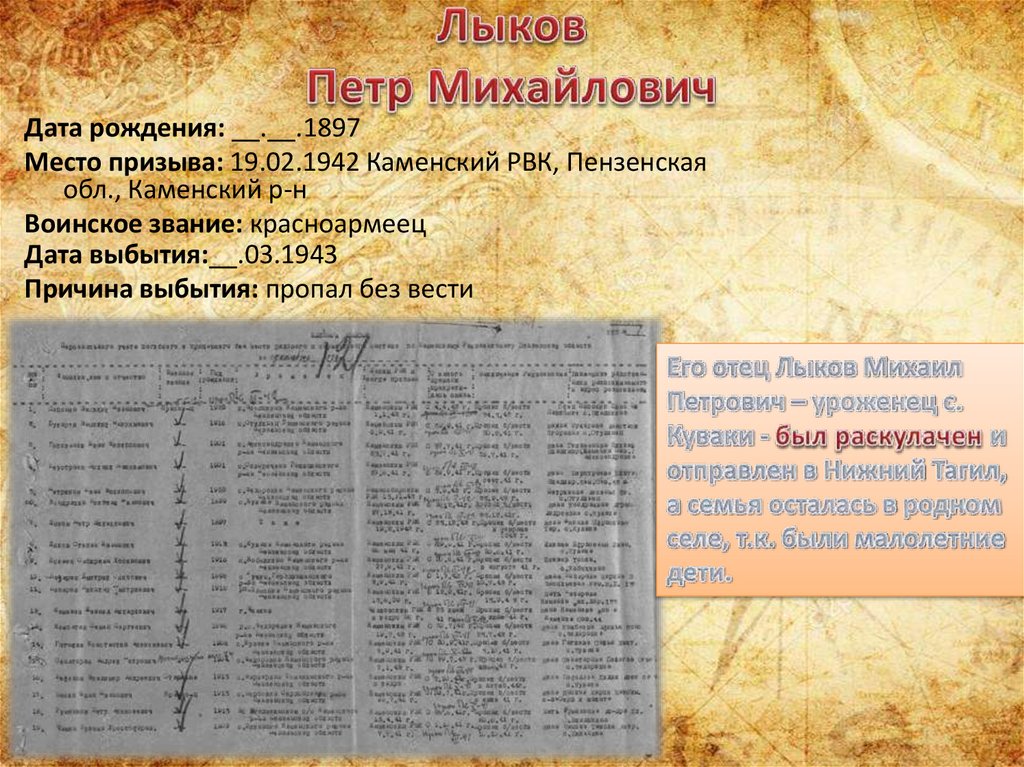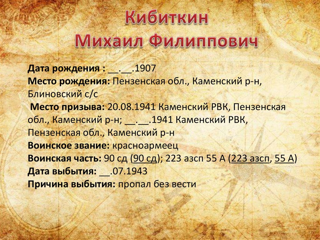 Дата рождения: __.__.1897Место призыва: 19.02.1942 Каменский РВК, Пензенская