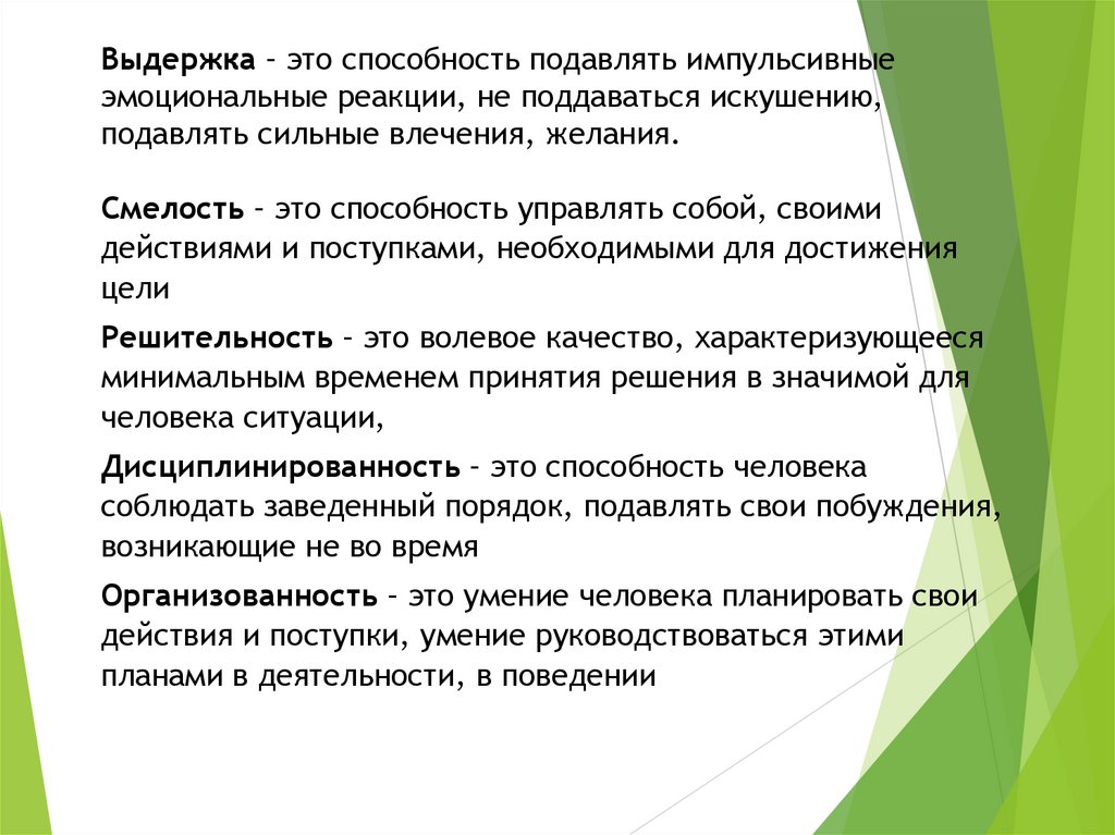 Выдержка – это способность подавлять импульсивныеэмоциональные реакции, не поддаваться искушению,