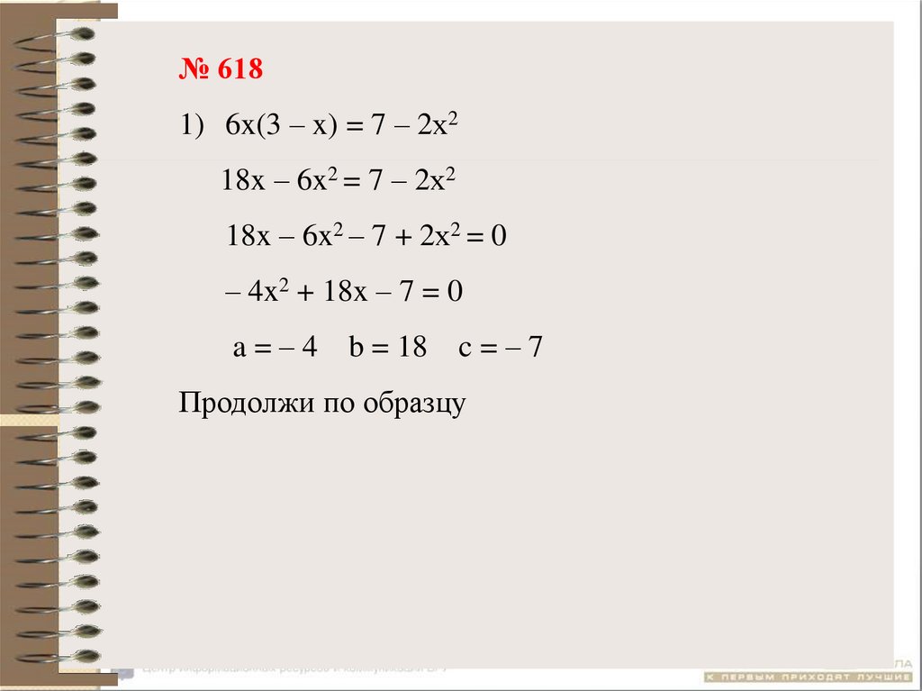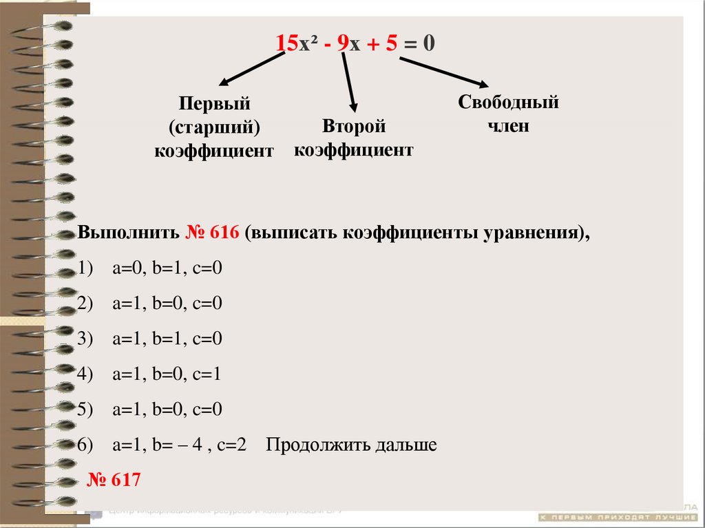 Выполнить № 616 (выписать коэффициенты уравнения),