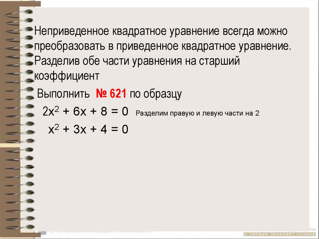 Неприведенное квадратное уравнение всегда можнопреобразовать в приведенное квадратное уравнение.