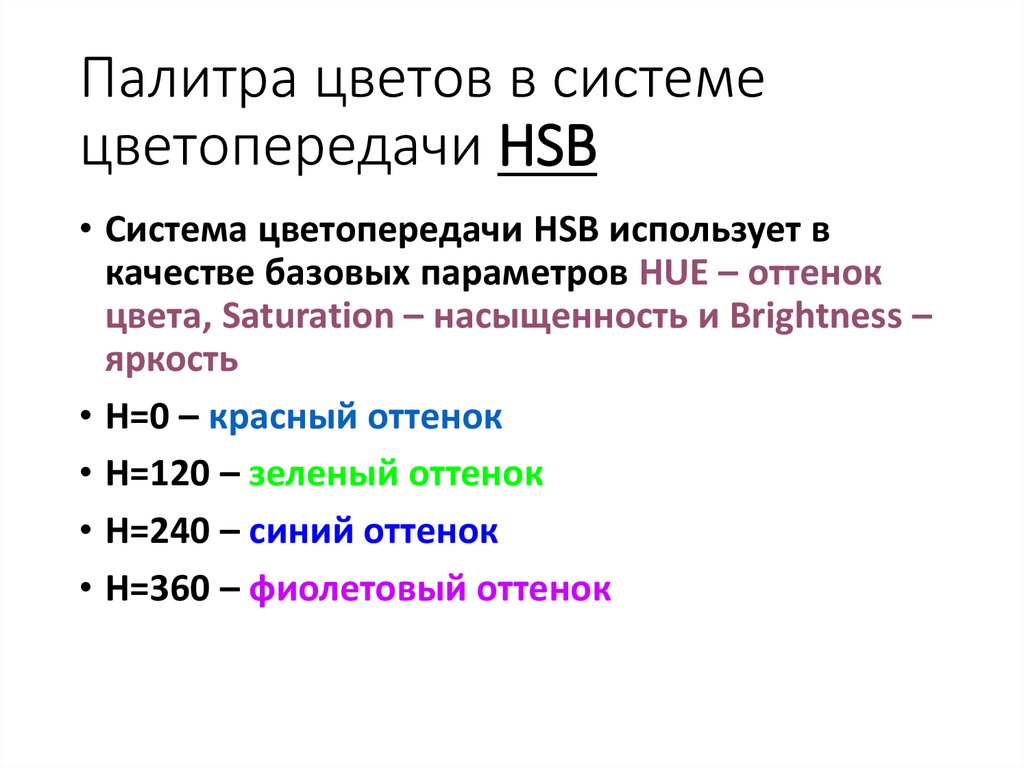 • Система цветопередачи HSB использует в