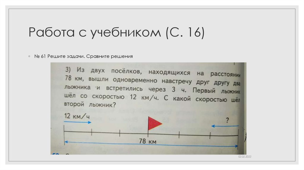 Работа с учебником (С. 16)◦ № 61 Решите задачи. Сравните решения