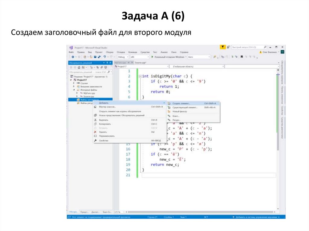 Задача A (5)В CPP файл второго модуля вставляем код функций isDigitMy, toUpperAll