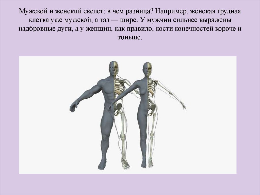 Мужской и женский скелет: в чем разница? Например, женская груднаяклетка уже мужской, а таз — шире. У мужчин сильнее выражены