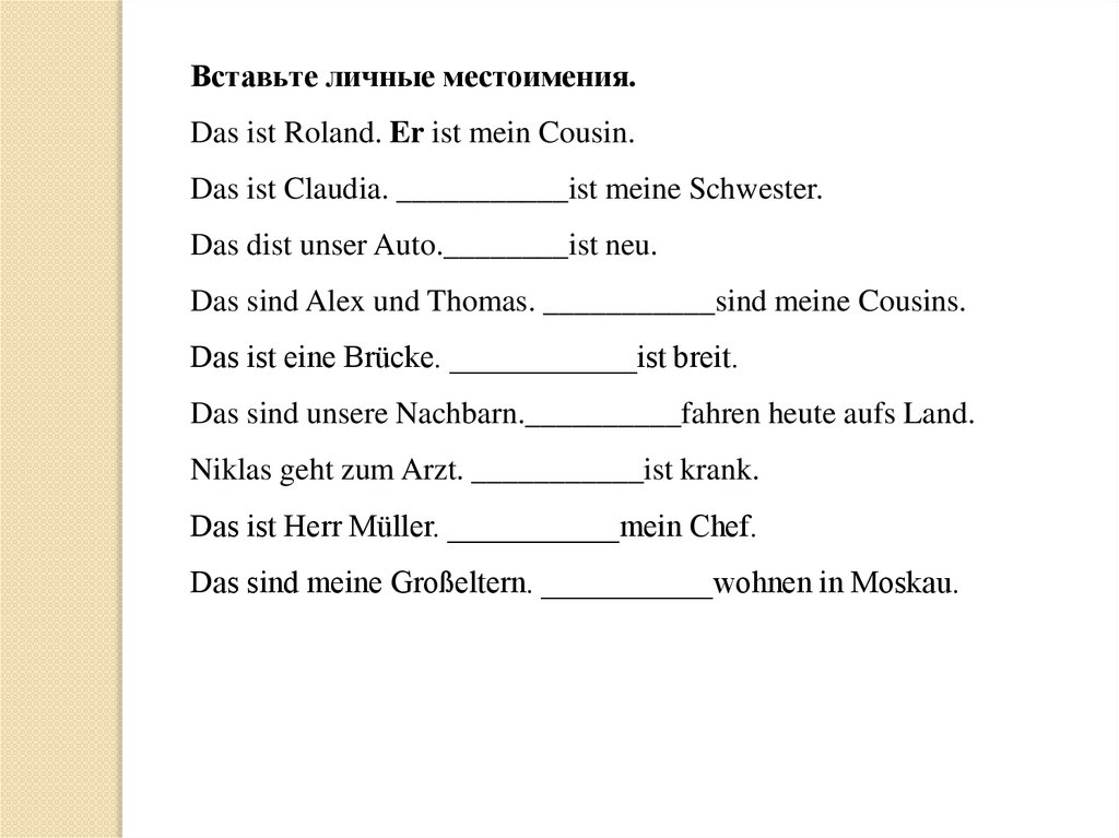 Вставьте личные местоимения.Das ist Roland. Er ist mein Cousin.