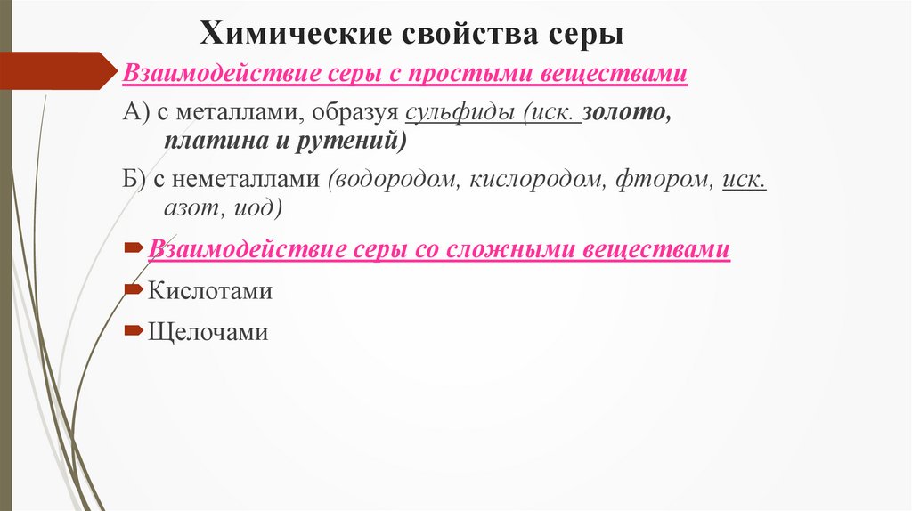 Химические свойства серыВзаимодействие серы с простыми веществами