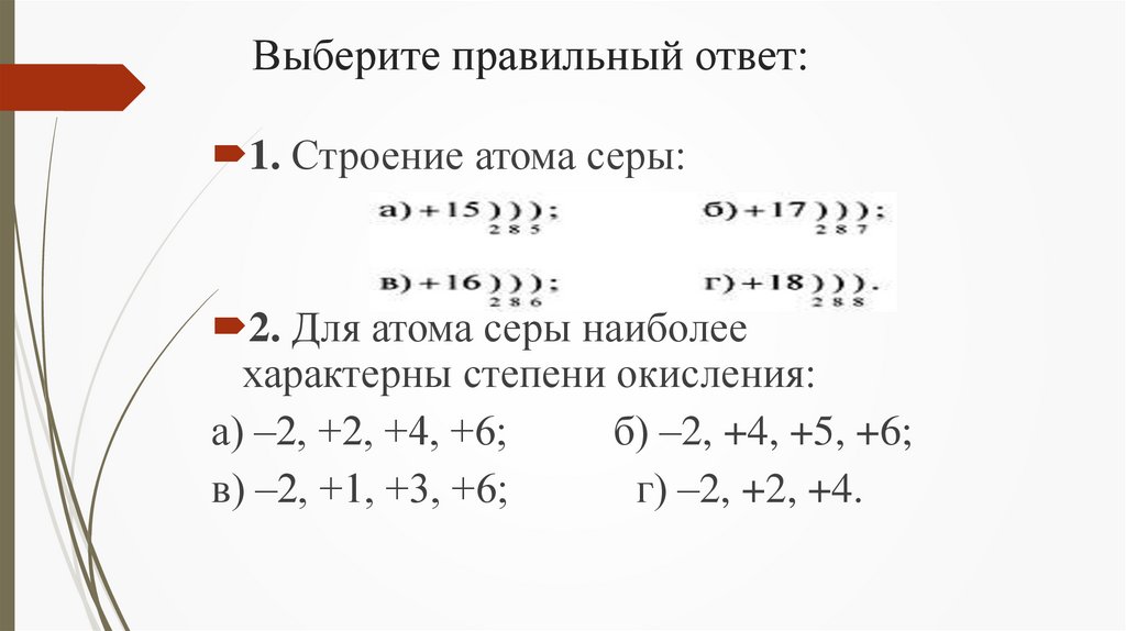 Выберите правильный ответ:1. Строение атома серы: