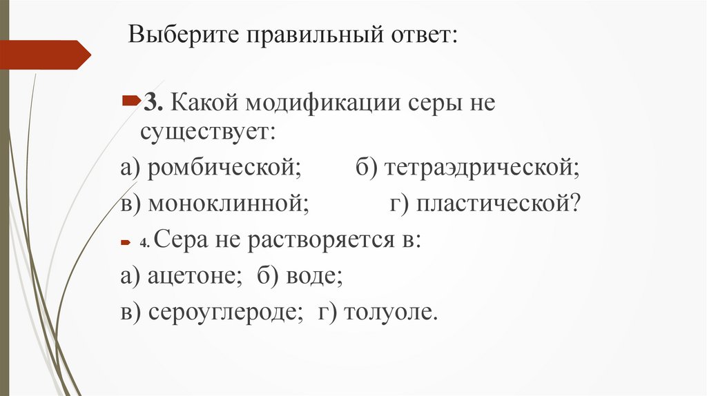Выберите правильный ответ:3. Какой модификации серы не