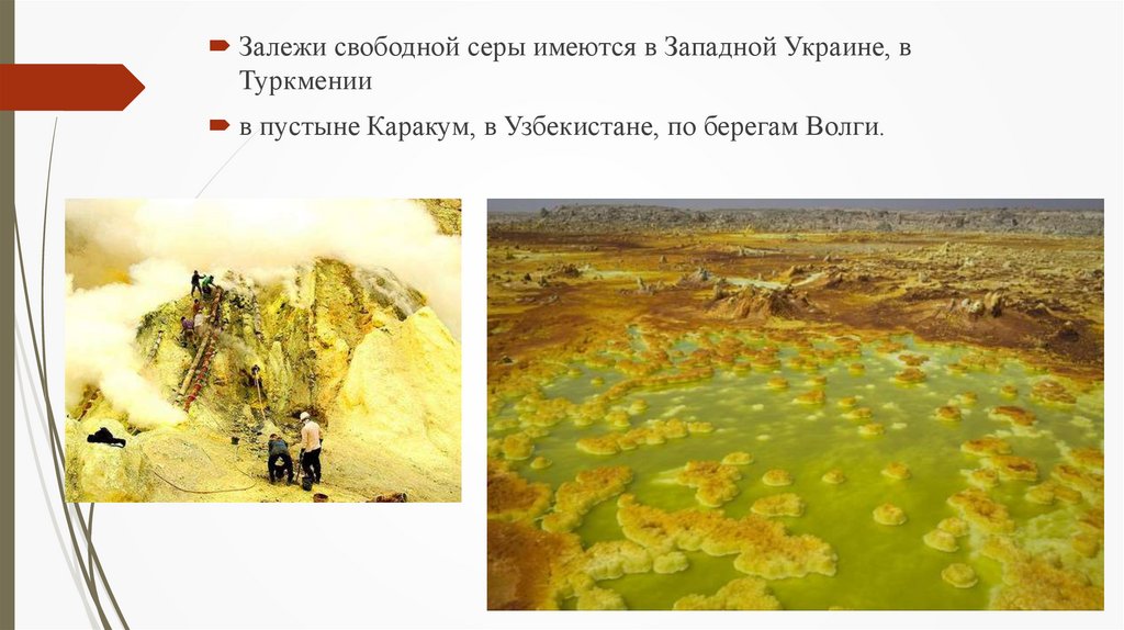 Залежи свободной серы имеются в Западной Украине, вТуркмении