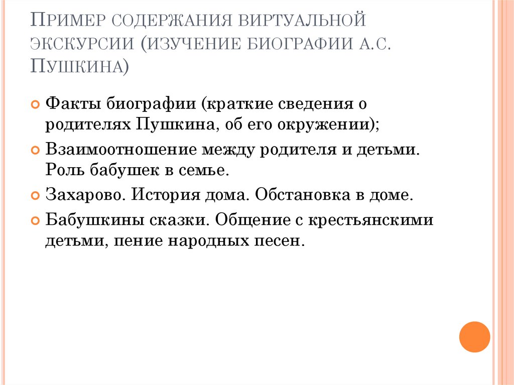 ПРИМЕР СОДЕРЖАНИЯ ВИРТУАЛЬНОЙЭКСКУРСИИ (ИЗУЧЕНИЕ БИОГРАФИИ А.С.
