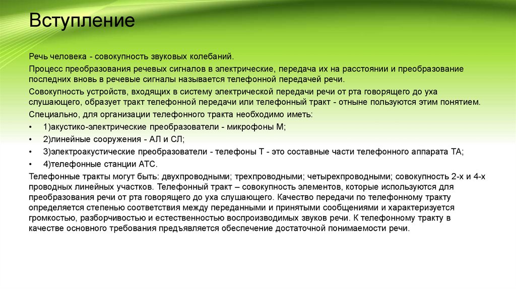 громкостью, разборчивостью и естественностью воспроизводимых звуков речи. К телефонному тракту в