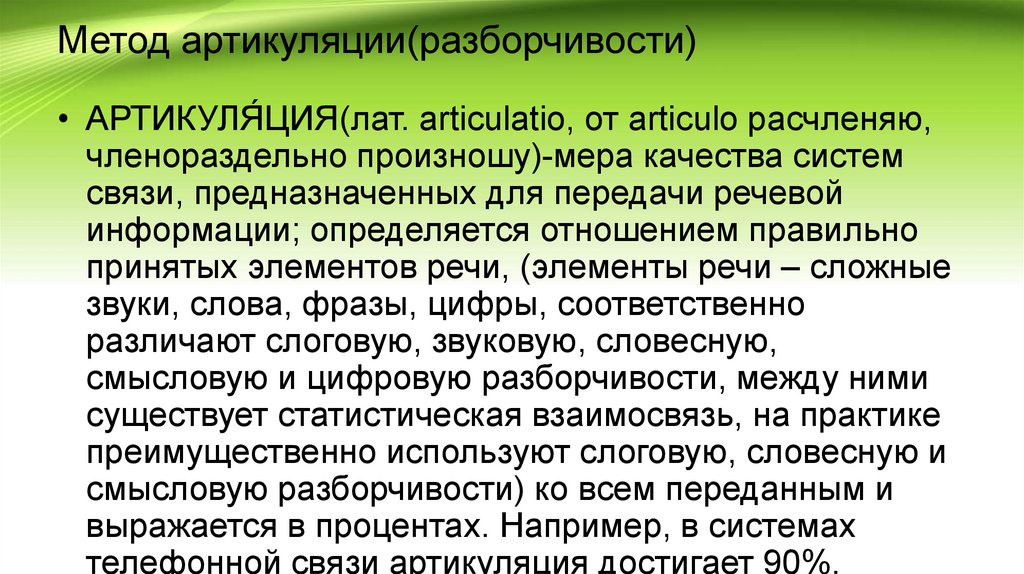 Метод артикуляции(разборчивости)• АРТИКУЛЯ́ ЦИЯ(лат. articulatio, от articulo расчленяю,
